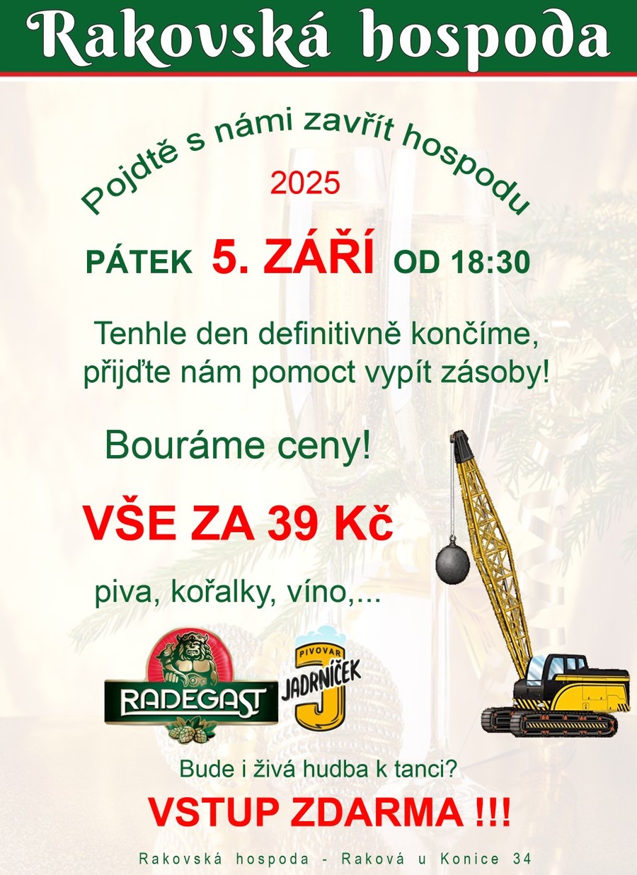 Rakovská hospoda si vás v pátek 5. září dovoluje srdečně pozvat na zavírání hospody, kdy bude vše za cenu do 39 kč.